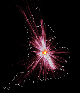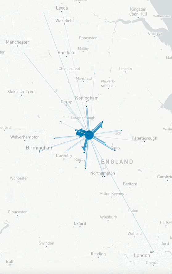 To get a feeling on the patterns Leicester’s key commuters define, first let us look at Figure 4, showing all the flows (K/Nk) registered in 2011. As expected, the vast majority of these flows are between MSOAs around Leicester, like Birmingham and Nottingham, but also London and even Scotland and Welsh regions.