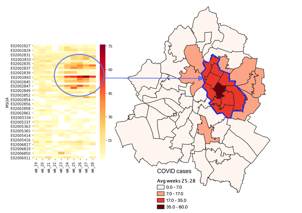 COVID-19 cases by week at MSOA level can be obtained at [4]. Figure 3 shows where the bulk of cases from weeks 19 to 28 are located.