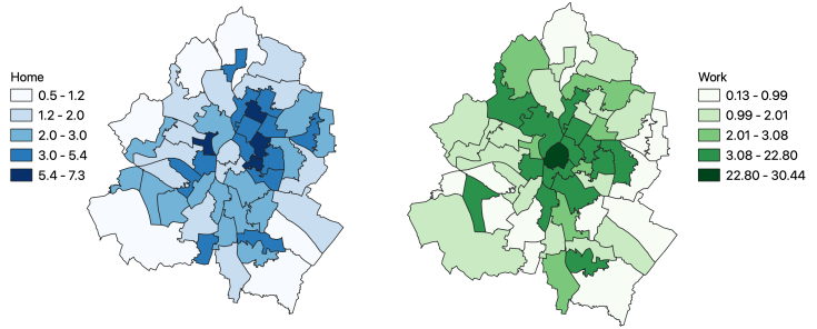 Our first task was to map the lockdown polygon supplied by the government into MSOA (Figure 2, top panel). In this area (51 MSOAs), the working population (16-65 yrs) was ~7,490 people in 2018, which is above the England and Wales average of 6,660 across 6,791 MSOAs. This “excess” in potential workers is reflected in a slightly high number of commuter trips from key workers into and from the lockdown area, compared with the rest of the country. The 2011 Census reports ~145,000 trips by road, bus and rail, with K workers’ trips accounting for 26% of those. So yes, high streets are deserted, but there are still areas with a good share of movement between them.