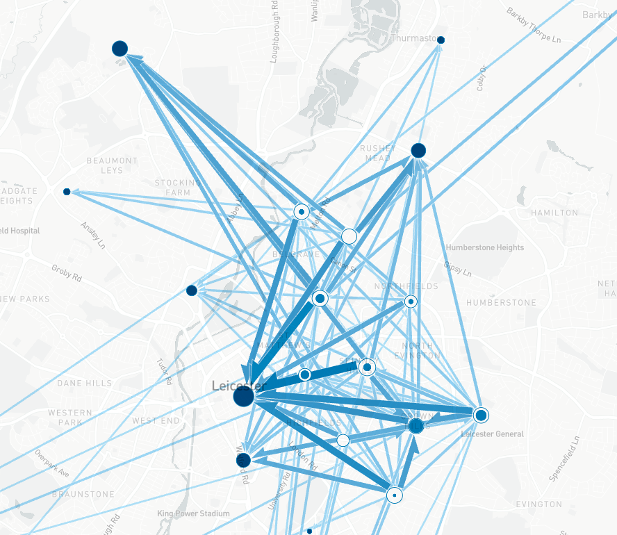 In June 29th, 2020, the government announced a local lockdown in Leicester following a surge in COVID-19 cases [1]. The areas affected are delimited by the boundary shown in Figure 1. These restrictions put Leicester back into a limited mobility scenario, where only the key workers are allowed to go to work. Areas with less key workers tend to have fewer people commuting, but, where are these areas? In this brief post, we want to show where Leicester’s key workers concentrate and investigate their spatial relation with regions with high COVID-19 cases. Also, we like to emphasise that a lockdown scenario not only reduces flows but does change, in general, the commuter patterns.
