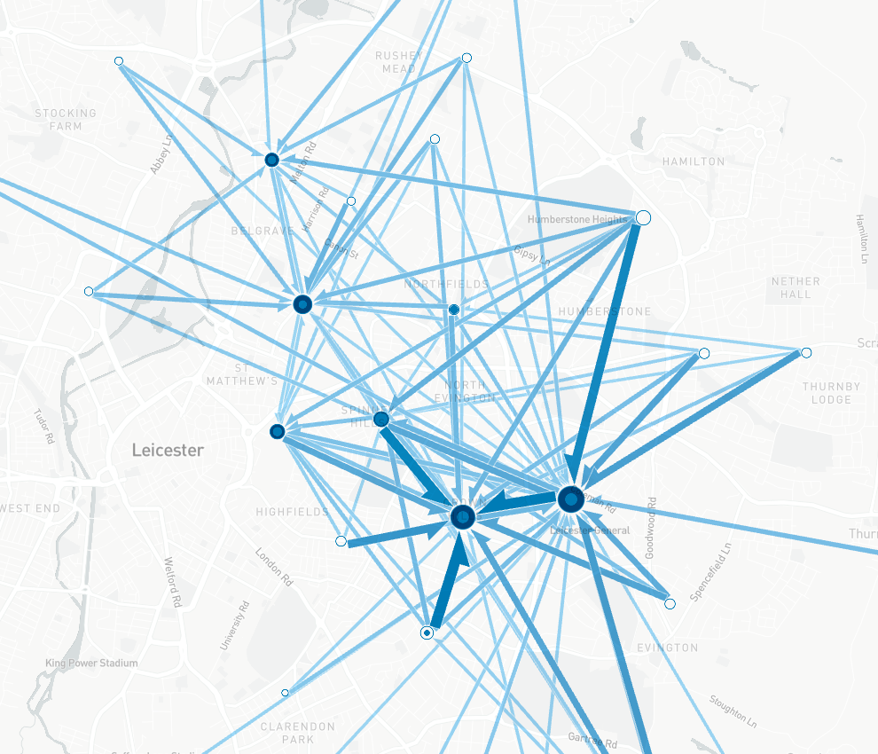 Commuters from the hotspot area travel mostly locally. However, as Figure 5 (left panel) shows, numerous key workers are travelling outside Leicester, even as far as London, Leeds and Manchester. Trips from these areas (Fig. 5 right upper) have Leicester centre as their preferred destination, but there are also significant flows to Glebelands, south of Thurmaston and from Spinney Hills! On of the highest COVID cases area in the last weeks. We need to further investigate the precise occupations commuting to this area to figure out why these high numbers.